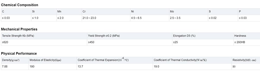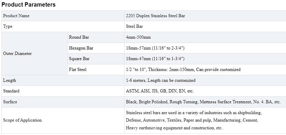 2205 Duplex stainless steel alloy bar is made of a duplex stainless steel composed of 22% chromium, 2.5% molybdenum and 4.5% nickel nitrogen alloy, which accounts for its high strength, good impact toughness and good overall and local resistance to stress corrosion.
