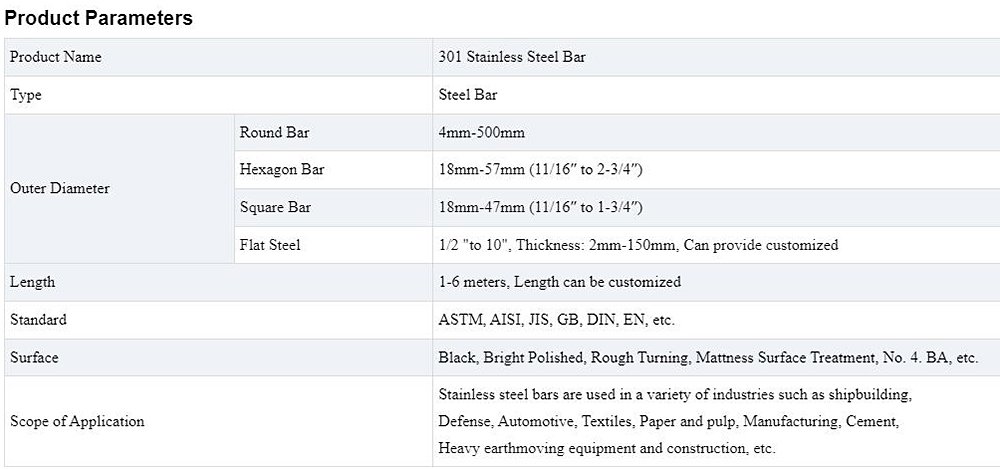 301 stainless steel bar is made of a metastable austenitic stainless steel that has a complete austenitic structure under full solid solution conditions. 301 is the steel type that can be most easily strengthened by cold deformation, through which the strength and hardness of the steel can be improved, and sufficient plasticity and toughness can be retained. 301 stainless steel bars are mainly used in the cold working state to reduce the weight of the equipment and make it rust-free. In addition, 301 stainless steel bars are prone to work hardening when impacted by external forces and can absorb more impact energy, providing more reliable safety protection for equipment and personnel. However, 301 stainless steel bars have less superior corrosion resistance in chemical media such as acid, alkali and salt, so they are not recommended for use in harsh corrosive environments.