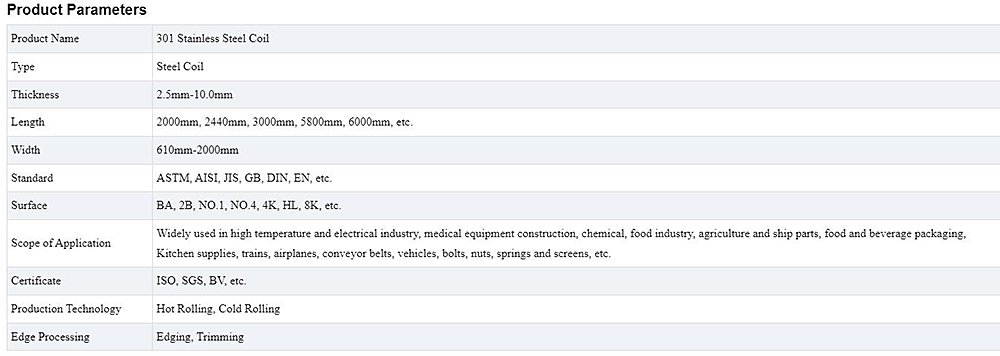 301 stainless steel coil is a metastable austenitic stainless steel that has a complete austenitic structure under full solid solution conditions. Among stainless steels, 301 is the steel type that is most easily strengthened by cold deformation. Through cold deformation processing, the strength and hardness of the steel can be improved, and sufficient plasticity and toughness can be retained. In addition, this steel has good rust resistance under atmospheric conditions. 301 is mainly used in the cold working state for equipment parts that can cope with higher loads, reduce the weight of the equipment and make it rust-free. In addition, this steel is prone to work hardening when impacted by external forces and can absorb more impact energy, providing more reliable safety protection for equipment and personnel. However, 301 stainless steel coil has poor corrosion resistance in chemical media such as acid, alkali and salt, so it is not recommended for use in harsh corrosive environments.