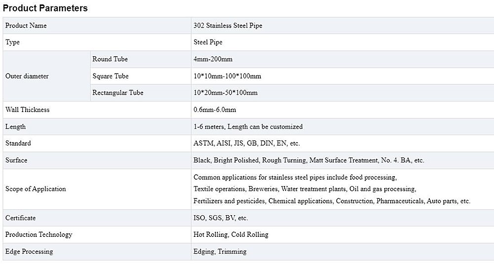 302 stainless steel pipe has excellent plasticity and toughness and works for various processing techniques, including cold working, so it can be manufactured in different shapes. And 302 stainless steel has good corrosion resistance, especially in oxidizing acids, atmosphere, steam and water. However, 302 stainless steel does not suit intergranular corrosion environments, so it is not recommended for environments with risks of intergranular corrosion. The chemical composition and performance characteristics of 302 stainless steel make it an ideal material for a variety of applications, including the manufacture of structural parts, weldments, non-magnetic components and cryogenic device components. Globally, there is a number of international corresponding brands to adapt to the standards and needs of different regions.