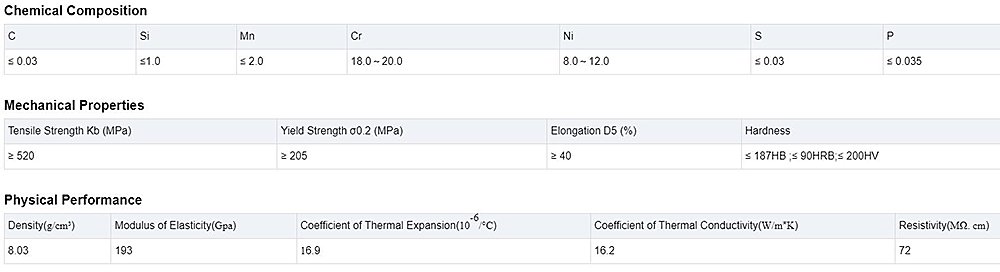 Similar to 304 stainless steel, 304L stainless steel has one key difference in its chemical composition. The maximum carbon content of 304 stainless steel is 0.08%, whereas grade 304L stainless steel has a maximum carbon of only 0.03%. This is why the “L” in 304L can be interpreted as extra-low carbon. It is usually used to produce equipment and parts that demand better corrosion resistance and formability.