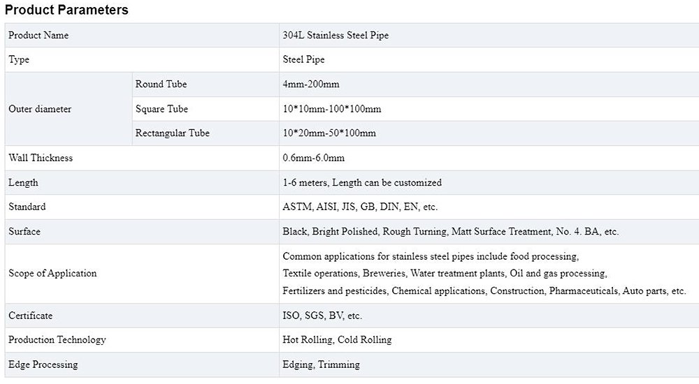 304L stainless steel pipe is a variant of 304 stainless steel pipe with a lower carbon content and is often used in welding scenarios. The lower carbon content greatly reduces the precipitation of carbides in the heat-affected zone close to the weld, and the precipitation of carbides is associated with intergranular corrosion of stainless steel in certain environments. Basically, the need to anneal weld joints prior to using the completed metal form is not needed using 304L, saving time and effort. Generally speaking, both 304 and 304L stainless steel plates can be used for many of the same applications. The differences are often not significant enough that one is considered more useful over the other. 304L stainless steel plate is more commonly used in fields such as food processing equipment, building materials, automobile parts.