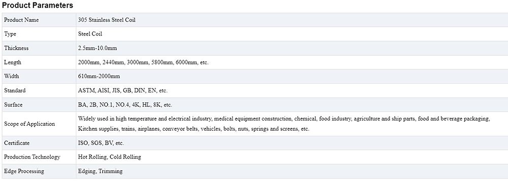 305 stainless steel coil has good corrosion resistance and can remain stable in various corrosive media. The oxide film formed on its surface can effectively prevent the contact between the corrosive medium and the material, thereby extending the service life of the material. 305 stainless steel coil has good heat resistance and can maintain stable performance at high temperatures. High amount of nickel element can improve the heat resistance of the material, making it less likely to deform, oxidize or fail at high temperatures. In addition, it has high strength and hardness and can withstand greater pressure and impact. Its high content of manganese element can improve the strength and hardness of the material, making it less likely to deform or break when under pressure.