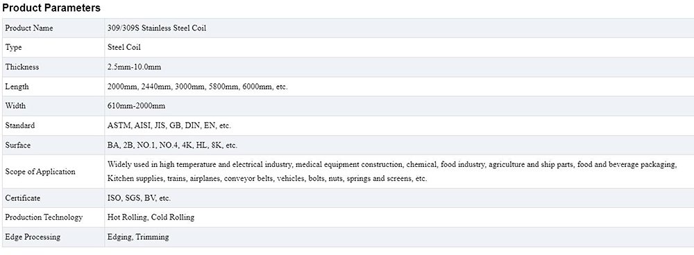 309 stainless steel is an austenitic stainless steel comprised of higher chromium and nickel content. 309 stainless steel coil has excellent corrosion resistance in various corrosive media, such as acid, alkali, salt and other solutions, as well as organic solvents. It can still hold up good corrosion resistance at high temperatures. Moreover, it has good high-temperature strength and creep properties and can work stably for a long time in high-temperature environments. It is ideal for high-temperature equipment in aviation, chemical industry and other fields. 309 stainless steel coil can be formed and welded through various processing methods and has good processing performance. Lastly, 309 stainless steel is non-magnetic and works for manufacturing parts and components without magnetic requirements.