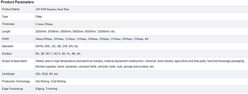 309 stainless steel is an austenitic stainless steel containing higher chromium and nickel content. 309 stainless steel has excellent corrosion resistance in various corrosive media, including acid, alkali, salt and other solutions, as well as organic solvents. It can still maintain good corrosion resistance at high temperatures.Moreover, it has good high-temperature strength and creep properties and can work stably for a long time in high-temperature environments. It is suitable for high-temperature equipment in aviation, chemical industry and other fields. 309 stainless steel can be formed and welded through various processing methods and has good processing performance. Lastly, 309 stainless steel is non-magnetic and suitable for manufacturing parts and components without magnetic requirements.