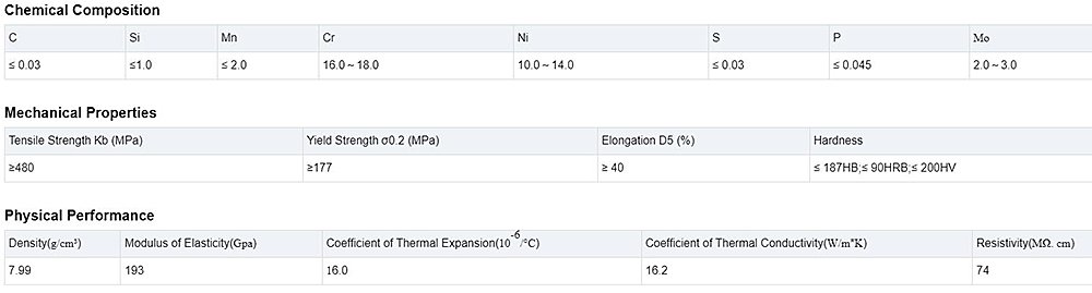 316L stainless steel, similar to 316 stainless steel, has a lower amount of carbon of no more than 0.03% in its composition. This is meant to reduce the risk of carbon precipitation, to make a better choice for welding to achieve maximum corrosion resistance.