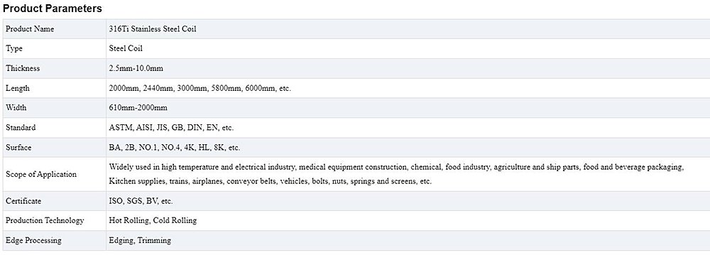 316Ti stainless steel comes with superior corrosion resistance in various corrosive media such as acids, alkalis, and salts. This is because it contains high chromium and nickel content, and an appropriate amount of titanium is added to the steel to improve corrosion resistance by forming a stable passivation film. 316Ti stainless steel has good processing properties, such as weldability, bending formability and machining performance. This facilitates easy processing and connection during the manufacturing process, adding to production efficiency. What is more, 316Ti stainless steel coil can still keep good strength and stability at high temperatures and can be used in the temperature range of -253°C to 400°C. This makes it widely used in high-temperature environments.