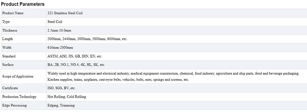 321 stainless steel has better crack resistance during the welding process owing to the titanium content. Besides, 321 stainless steel also has good processing and welding properties, which makes it easy to perform cutting, bending, welding and other processing operations. Its mechanical properties such as tensile strength, flexural strength and elongation are also outstanding, and can fulfill the requirements of use in various complex environments. Because 321 stainless steel coils have excellent corrosion resistance and high temperature performance, they are often used in petroleum, chemical industry, aviation, aerospace fields. In the petroleum and chemical industries, since the production process involves a large amount of corrosive media such as acids, alkalis, and salts, 321 stainless steel coil manages to resist the corrosion of these media and ensure the long-term stable operation of the equipment.