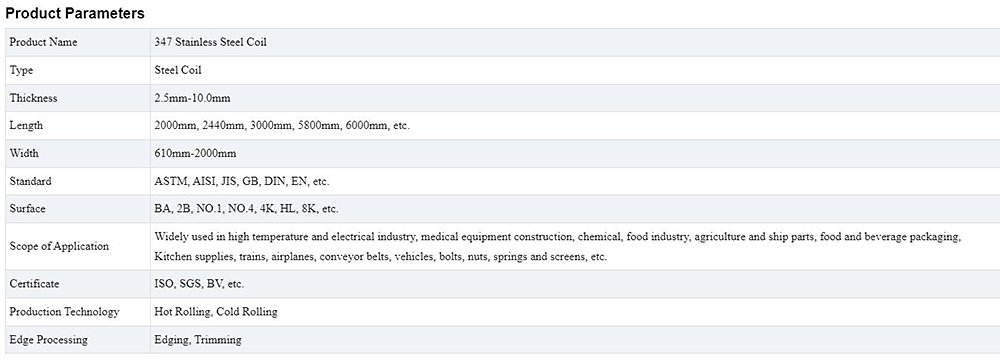 347 stainless steel coil is more durable than other stainless steel materials under high temperatures. This makes it very popular when working in high temperature environments. In high-temperature corrosive environments, 347 stainless steel maintains its strength and durability without embrittlement or fatigue. Moreover, 347 stainless steel coil has excellent corrosion resistance. Its ability to remain stable in corrosive environments with strong acids and bases such as chloride ions and sulfide ions makes it perfect for use in the chemical and petroleum industries. In addition, 347 stainless steel also has good processing properties. It can be processed into various shapes by various methods such as forging, quenching, annealing and cold working. So it is popular in industries such as chemical, petroleum, pharmaceutical and food processing as a result of its high temperature durability, corrosion resistance and processability.
