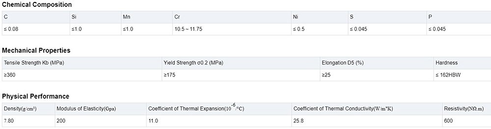 409 stainless steel is distinguished from other types of stainless steel for its chemical composition.  Iron, with large amounts of chromium and small amounts of carbon, manganese, silicon and nitrogen compose this material. Iron is the primary element of 409 stainless steel, providing its strength and stability. Chromium accounts for its corrosion resistance and helps form a protective oxide layer on the surface. Carbon helps increase the hardness and wear resistance. Manganese acts as a stabilizer to prevent excessive grain growth during heat treatment. Silicon enhances oxidation resistance while preventing scaling at high temperatures. Nitrogen improves mechanical properties such as tensile strength and yield strength. This unique combination of elements gives 409 stainless steel excellent thermal expansion capabilities, making it suitable for high-temperature applications without compromising its structural integrity or dimensional stability. Its chemical composition also provides good solderability, thus simplifying the manufacturing process.
