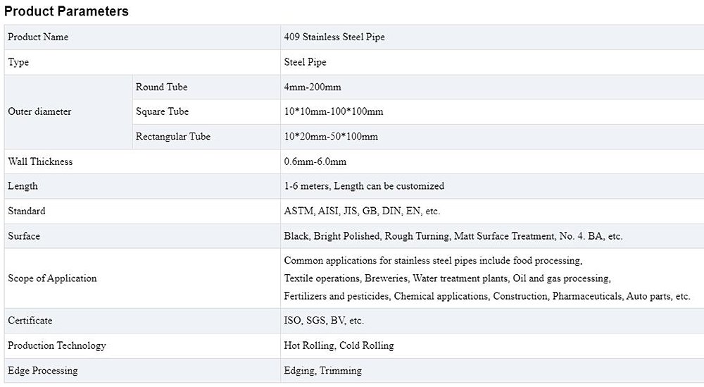 The chemical composition of 409 stainless steel pipes sets it apart from other stainless steels. It is mainly comprised of iron, with large amount of chromium and small amounts of carbon, manganese, silicon and nitrogen. Iron is the main element of 409 stainless steel, making for its strength and stability. Chromium helps form a protective oxide layer on the surface to ensure corrosion resistance. Carbon adds to the material’s hardness and wear resistance. Manganese acts as a stabilizer to prevent excessive grain growth during heat treatment. Silicon enhances oxidation resistance while minimizing scaling at high temperatures. Nitrogen improves mechanical properties such as tensile strength and yield strength. This unique combination of elements gives 409 stainless steel excellent thermal expansion capabilities, making it suitable for high-temperature applications without jeopardizing its structural integrity or dimensional stability. Its chemical composition also helps achieve good solderability, thus simplifying the manufacturing process.