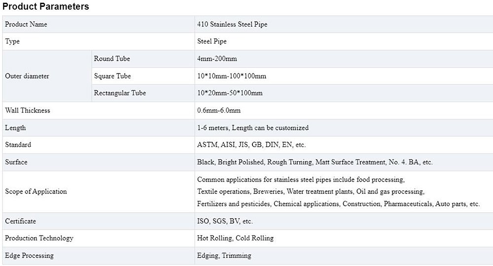 410 stainless steel is a type of martensitic stainless steel containing 11.5% of chromium to achieve excellent corrosion resistance. Additionally, 410 stainless steel has been quenched, tempered and polished to improve corrosion resistance and hardness. Compared to austenitic stainless steel, martensitic stainless steel is less superior as it requires a final heat treatment before manufacturingGrade 410 stainless steel has the property to withstand hot gases, steam, food, weak acids and bases, fresh water, and dry air. 410 stainless steel pipe is a versatile and popular choice in automotive manufacturing due to numerous advantages. A key advantage of this material is its high strength, making it ideal for applications requiring durability and wear resistance.