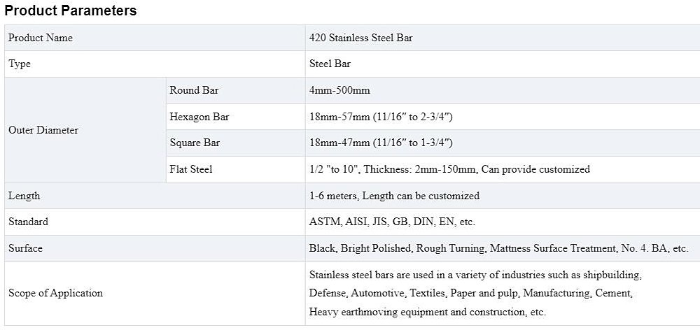 420 stainless steel bar is a medium carbon stainless steel. Under normal circumstances, 420 stainless steel has rather limited heat resistance and is favored for low-temperature working environments. Its maximum operating temperature is usually 650°C. Certain heat treatment processes, such as solution treatment and quenching and annealing are usually implemented to improve the heat resistance of 420 stainless steel by improving the material’s grain boundary structure and grain size. The heat resistance of 420 stainless steel is lower than other heat-resistant stainless steels. So 420 stainless steel bars are not the perfect option for high temperature uses.