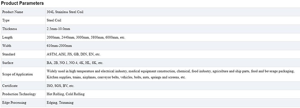 304L stainless steel coil is a variant of 304 stainless steel coil with a lower carbon content and is used where welding is involved. The lower carbon content minimizes the precipitation of carbides in the heat-affected zone close to the weld, and the precipitation of carbides may lead to intergranular corrosion of stainless steel in certain settings. Basically, using 304L spares the need to anneal weld joints prior to using the completed metal form, saving time and effort. Generally speaking, both 304 and 304L stainless steel coils can be used for many of the same applications. The differences are often minor enough that one isn’t considered massively more useful over the other. 304L stainless steel coil is widely used in fields such as food processing equipment, building materials, automobile parts.