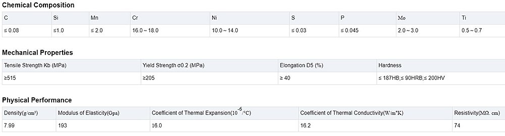 316Ti is a titanium stabilized version of 316 molybdenum-containing austenitic stainless steel. It is more resistant to general corrosion and pitting/crevice corrosion than traditional chromium-nickel austenitic stainless steels such as 304.